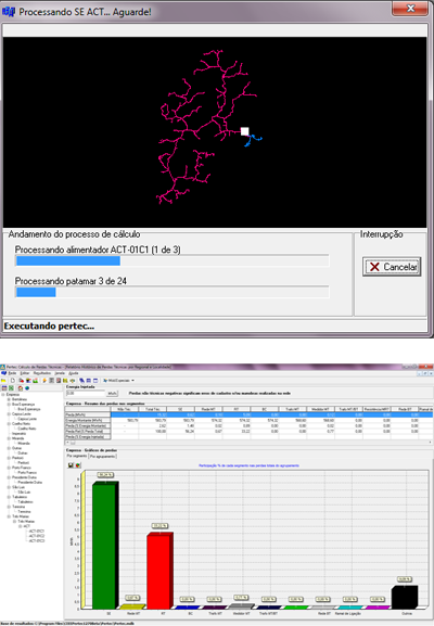 Detailed calculation of energy losses and demand in all system components: meter, household connection, low voltage network, distribution transformer, medium voltage network, capacitor bank, voltage regulator, substation and high voltage network..